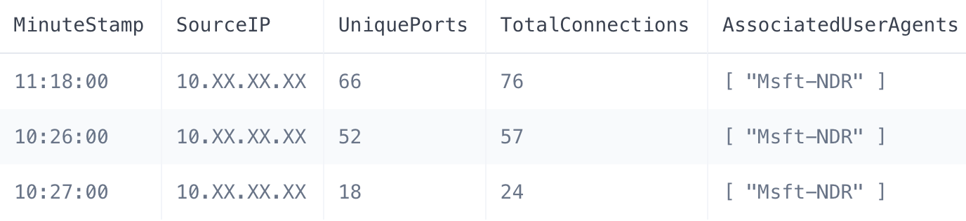 A SenseOn agent was deployed to their environment quickly and analysts began investigating the telemetry as this was being ingested. In one example we can see a source IP establishing 76 connections to 66 unique ports, all within a one minute timeframe, against the device with SenseOn deployed. The telemetry ingested had been determined by SenseOn as HTTP, this allowed us to view the associated user agent of these connections. An example screenshot of the telemetry observed can be seen below: